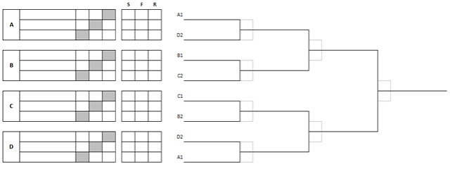 The first two out of every pool will be entered on the tournament grid, respecting the principles of separation (see Group Phase) as much as possible. The 1st place of one pool will compete with the 2nd place of another pool.